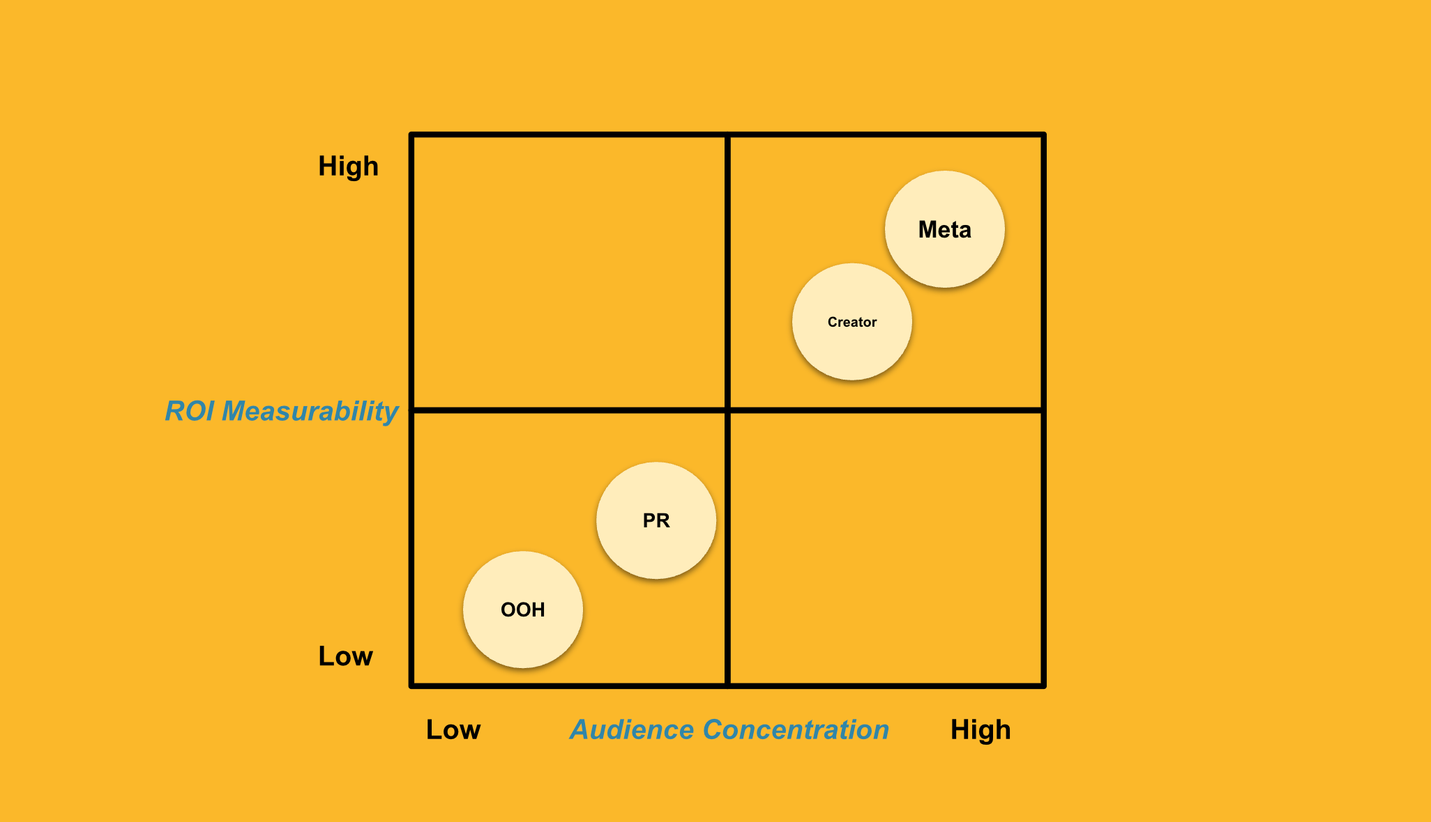 Score each channel on the 2x2 matrix: audience vs ROI measurability.
